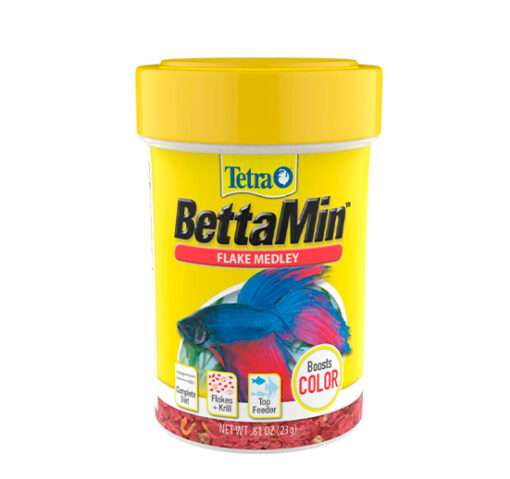 Alimento para peces Betta que realza su color. Hojuelas delgadas y rojas, y camarones secos