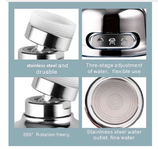 Rotación de 360 grados, se puede ajustar al grifo del fregadero de la cocina. Gira en cualquier dirección o ángulo. Haz que el fregadero de la cocina este limpio sin esquinas sucias es fácil y práctico para la limpieza de la cocina. Boquillas ajustables de 3 velocidades, palanca de una tecla conveniente y flexible, previene eficazmente salpicaduras de agua, ahorra 30% ~ 70% de agua. Se adapta a grifos redondos de 15-22mm de un diámetro estándar con rosca externa de 22mm e rosca interna de 24mm. Fácil instalación sin herramientas, hecho en segundos. Acabado cromado pulido, material plástico ABS, alta dureza, resistente al desgaste, resistente al óxido y la corrosión, duradero. Se puede colocar en el grifo del fregadero, el grifo de la cocina, el grifo del baño, etc. Fácil de limpiar, solo tienes que retirar el filtro y aclararlo bajo el agua.