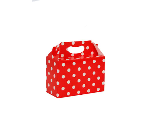 Caja fantasía de cartón con la temática roja puntos blancos, el diseño de las 4 caras está tal como se muestra en las imagenes. El paquete contiene 6 piezas.