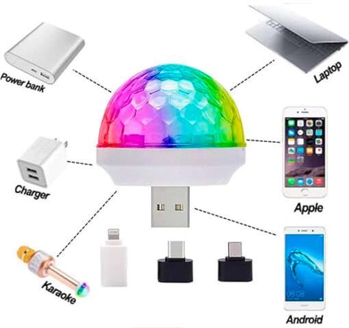 La mini bola de discoteca es muy pequeña y portátil, potente, puede proporcionar luz brillante y intermitente, perfecta para traer un ambiente de bola de discoteca, hermosos dispositivos, hermosos y coloridos. Adecuado para muchas ocasiones, tales como: fiesta de cumpleaños, fiesta en la piscina, discoteca, baile, fiesta de pijama, vacaciones, boda, Navidad, ambiente de coche, karaoke, DJ, Halloween, fiesta o al aire libre, dormitorio, sala de estar y jardín. Fácil de usar; utiliza el conector del teléfono para convertirlo, se puede utilizar para teléfonos celulares: (el teléfono móvil necesita abrir ajustes, más ajustes – OTG – abierto, se puede utilizar). Luces coloridas, mejoran el ambiente del escenario, aportan un mejor canto y disfrute. Rango de flash: 5-10 m, tamaño del cuerpo de la lámpara: 4 cm x 4 cm.