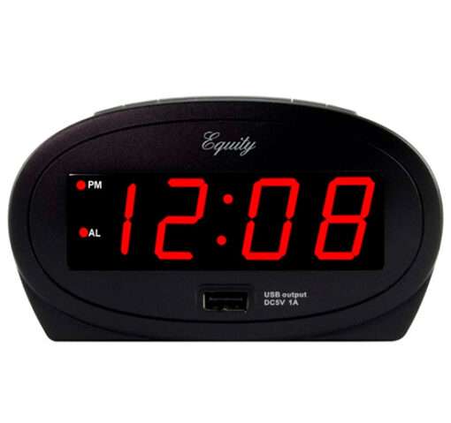 El despertador LCD EQUITY – 15LC0015. Reloj despertador con pantalla LED roja de 0,9 pulgadas con puerto de carga USB. Carga tu teléfono u otro dispositivo USB con 1 puerto de carga AMP, (teléfono y cable de carga no incluido). Visualización constante de la hora y la fecha de la alarma, y por supuesto, repetición. Largo 2.2″, Ancho 6.1″, Alto 4.7 Pulgadas