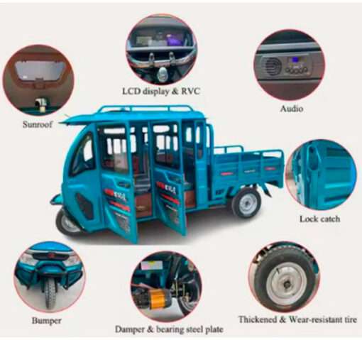 Velocidad Máxima: 30-50 Kilómetros por hora, Tipo de Unidad: Eléctrico, Tiempo de Carga (h): 7-9H, Lugar de Origen: Jiangsu, China, Capacidad de Grado: 20-25°, Tamaño: 3500*1080*1650mm, Kilometraje de Conducción :50-70Km, Nombre del Producto: Triciclo Eléctrico Semicerrado, Solicitado: Cargar, Capacidad de Carga: 400 kilos, Autonomía: Abierto, Velocidad Máxima (Km/h): 45Km por hora, Proceso de dar un título: CCC, Color: Personalizable, Pasajeros: 4, Rango: 40-80 Kilómetros, Sistema de Frenos: Tambor Delantero + Tambor Trasero, Mostrar: Pantalla LCD, Tamaño de Neumáticos: Neumático delantero/Trasero 375-12, Freno: Freno de Tambor 2, Peso en Vacío: 300-400 Kilos, Potencia del motor: 1000W/1200W/1500W, Capacidad de Carga Útil: 300-400 Kilos, Material: Acero Hierro, Usar: Carga y Pasajeros