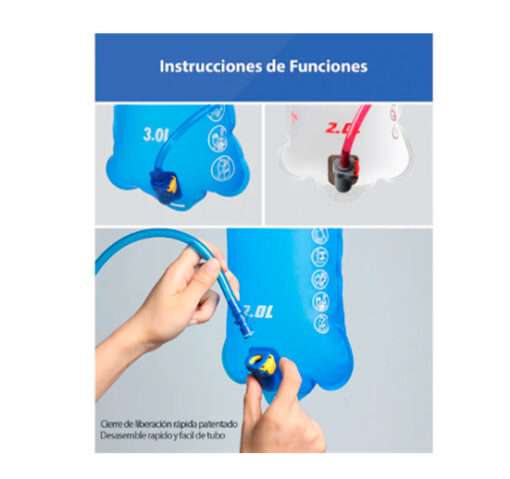 -Boca de bloqueo automático: bolsa de hidratación con válvula de encendido/apagado. La válvula de cierre automático evita fugas cuando se desconecta el tubo.